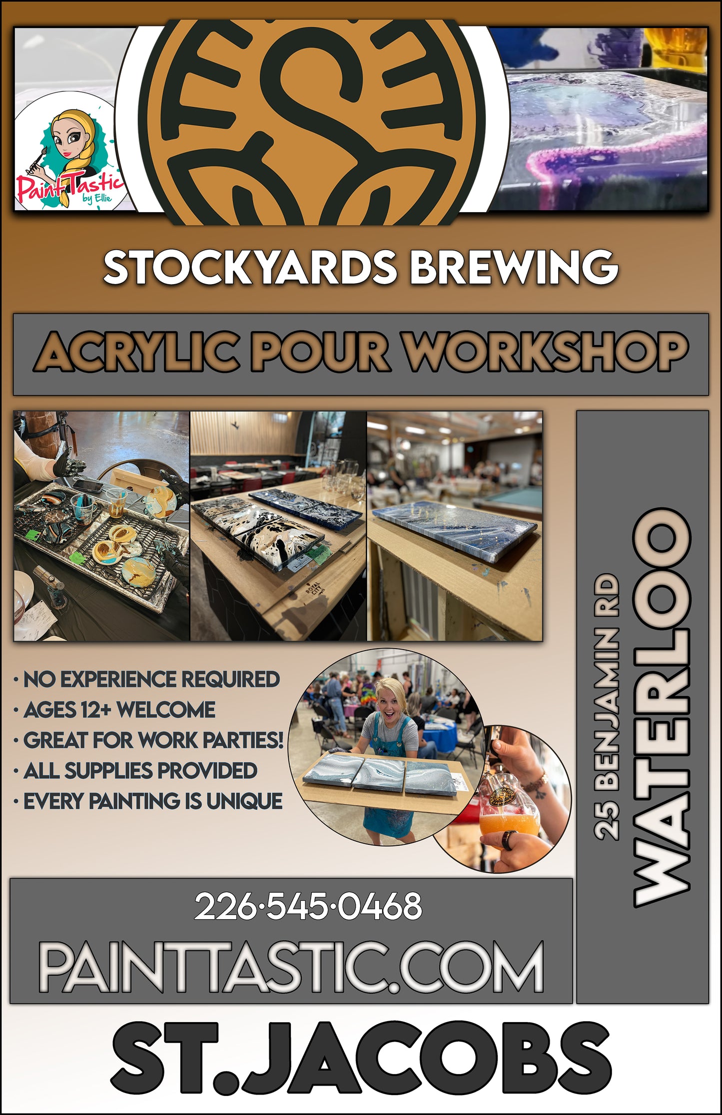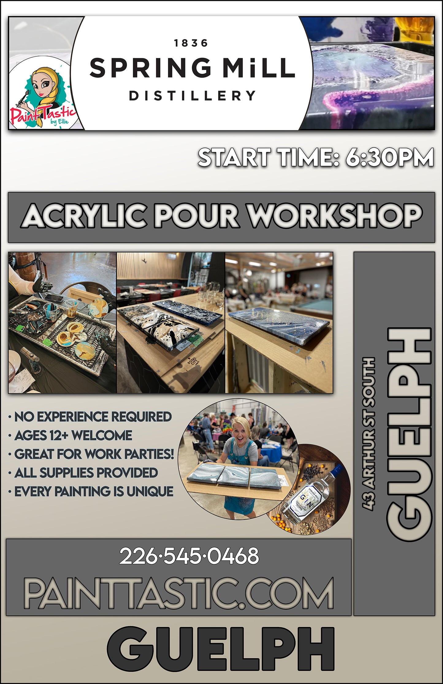 We can accommodate up to 60 painters with our POUR PAINTING PARTY service, and with our established venues ranging from Chatham-Kent to Hamilton, we can help provide a venue.