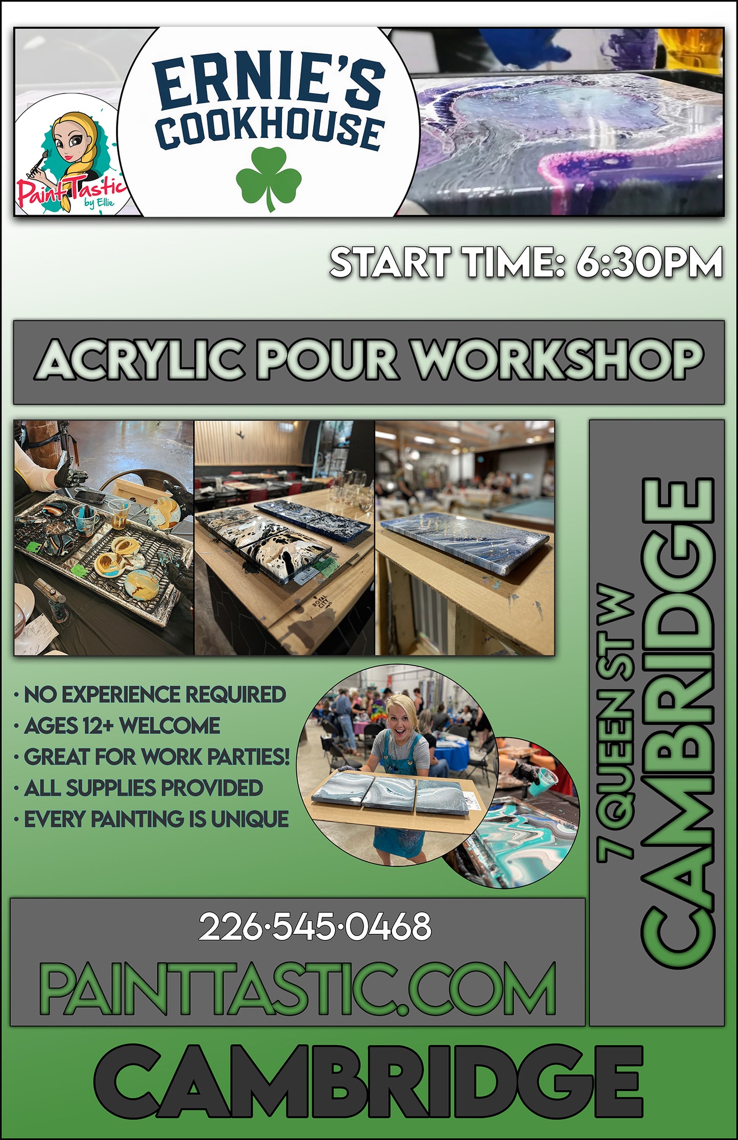- If you are running late to one of our workshops there's no need to worry! Unlike regular paint nights where everyone paints at the same time, our Pour Paint Workshops offer a more flexible experience. Ellie visits each group and table to give one-on-one instruction like colour choices and pouring techniques. Regardless of your arrival time, you will still receive the same quality of service.