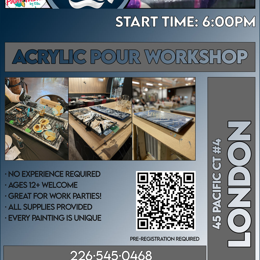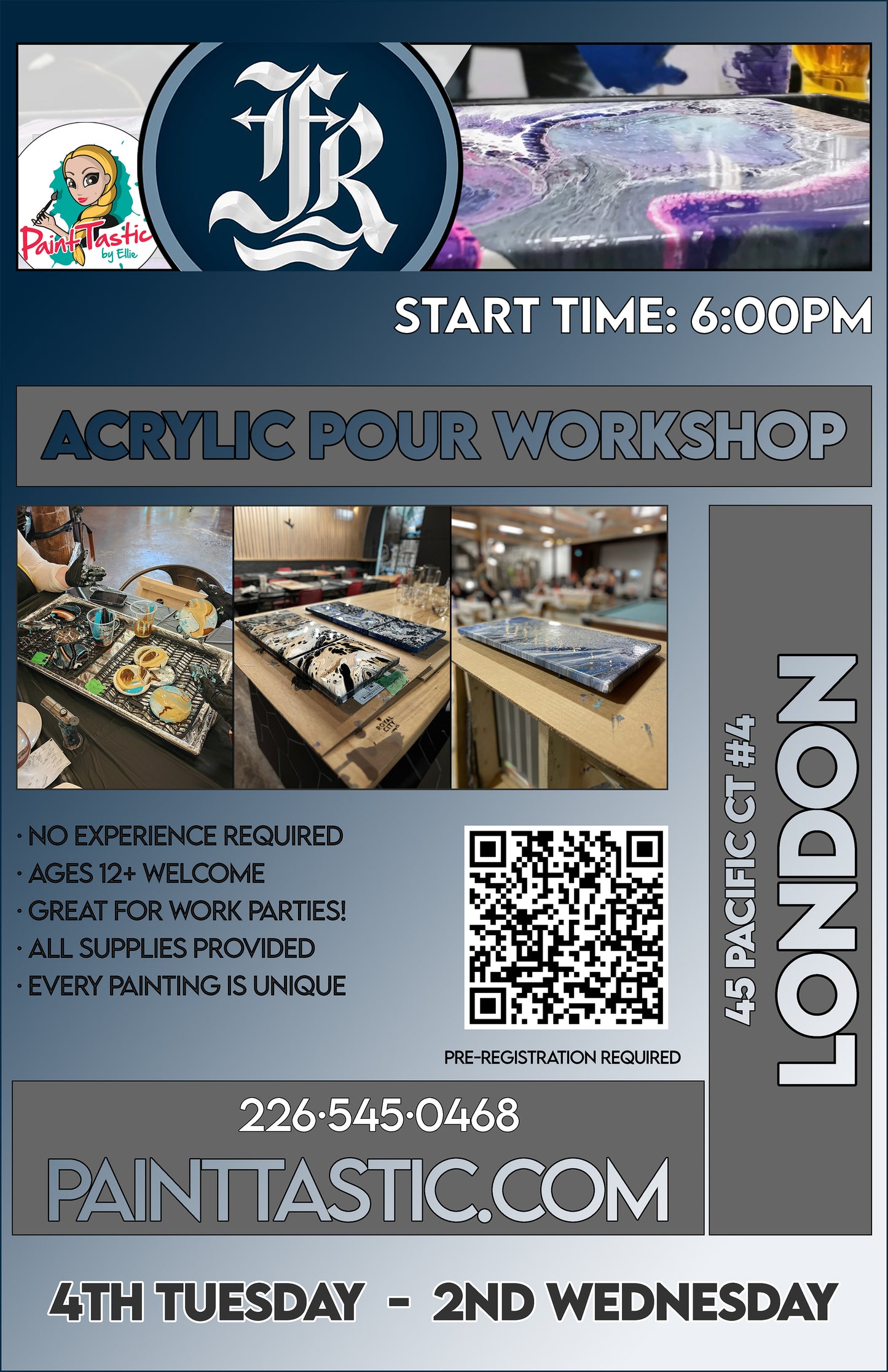 - If you are running late to one of our workshops there's no need to worry! Unlike regular paint nights where everyone paints at the same time, our Pour Paint Workshops offer a more flexible experience. Ellie visits each group and table to give one-on-one instruction like colour choices and pouring techniques. Regardless of your arrival time, you will still receive the same quality of service.