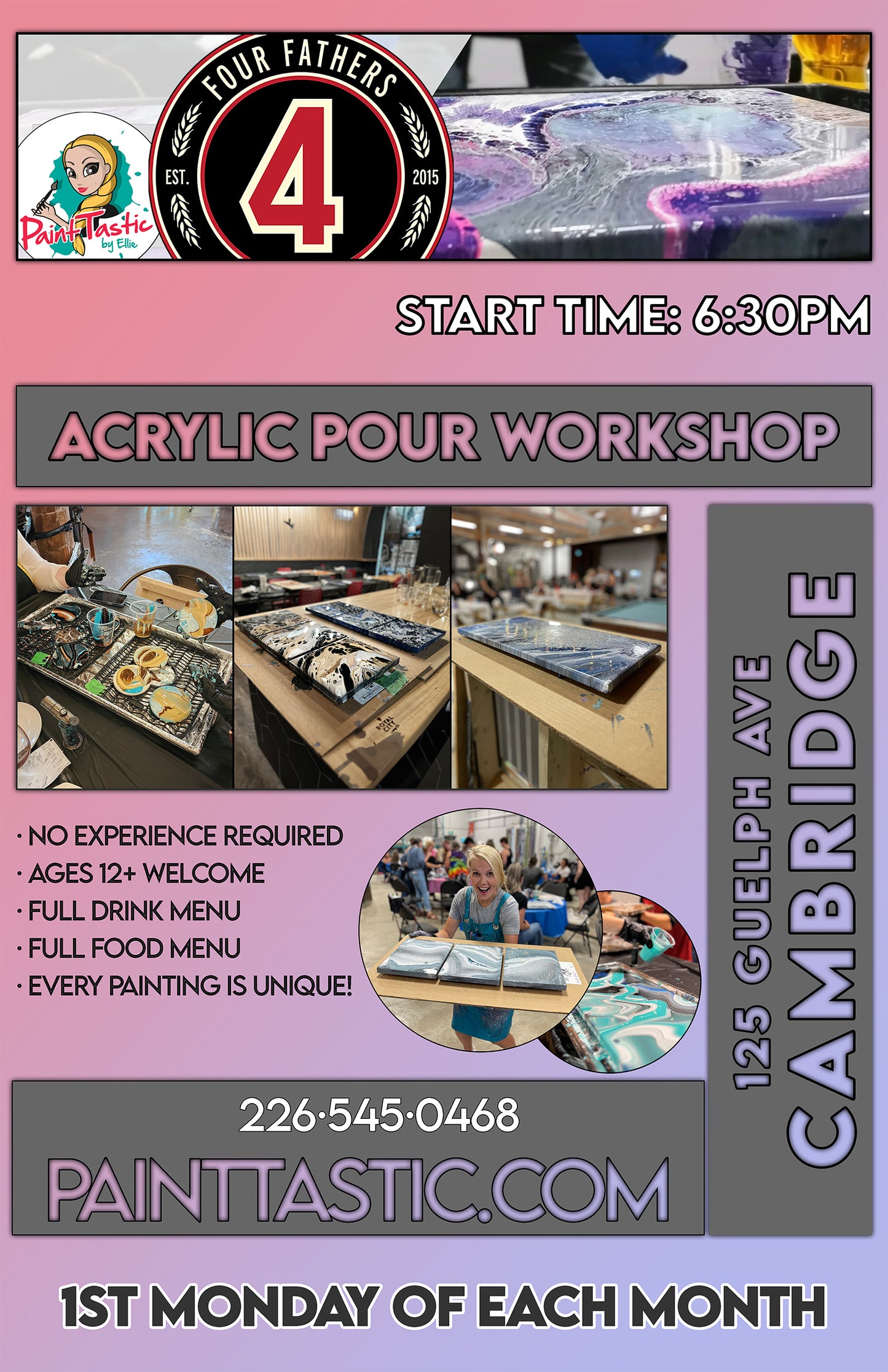 - If you are running late to one of our workshops there's no need to worry! Unlike regular paint nights where everyone paints at the same time, our Pour Paint Workshops offer a more flexible experience. Ellie visits each group and table to give one-on-one instruction like colour choices and pouring techniques. Regardless of your arrival time, you will still receive the same quality of service.
