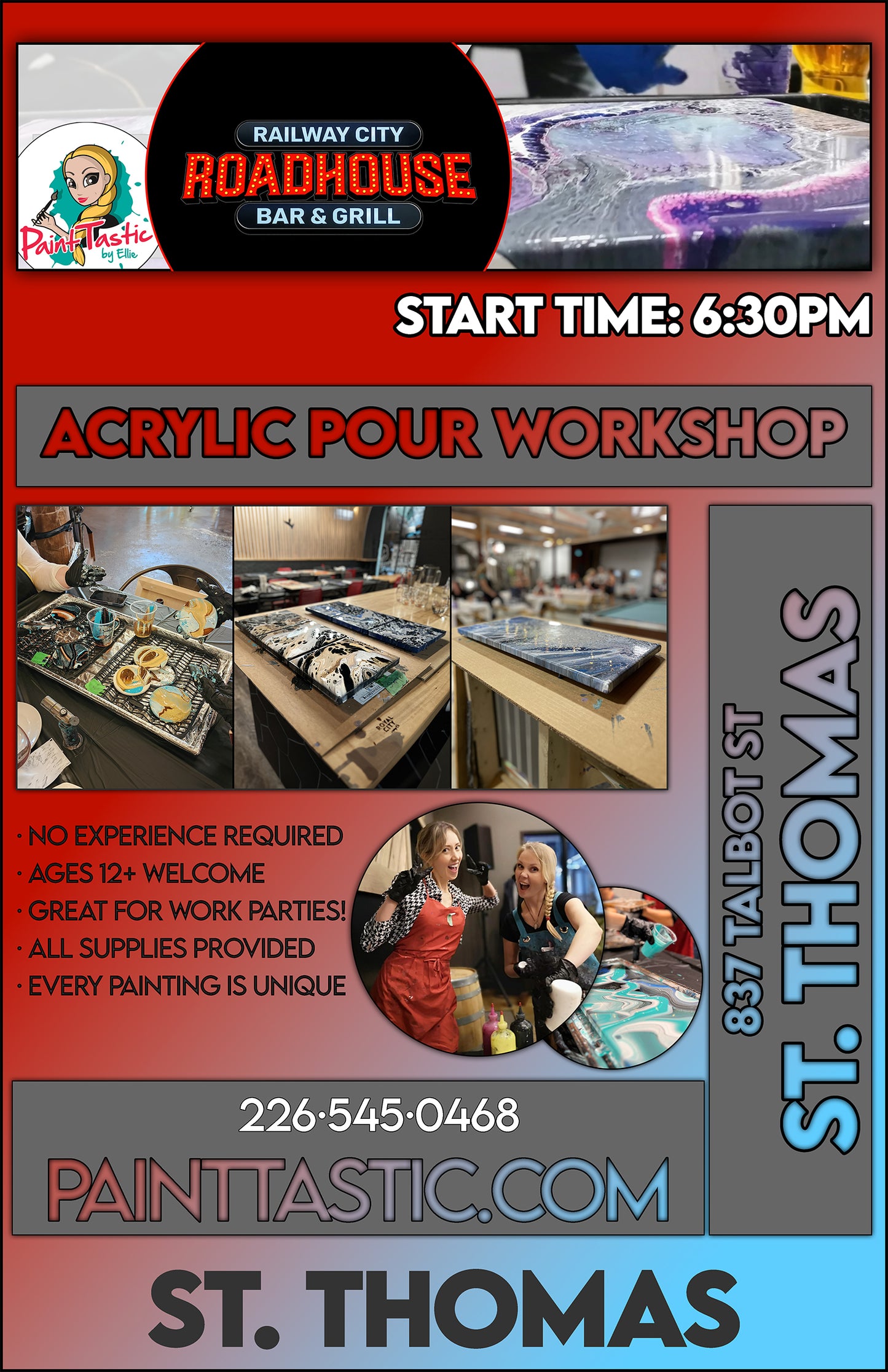 - If you are running late to one of our workshops there's no need to worry! Unlike regular paint nights where everyone paints at the same time, our Pour Paint Workshops offer a more flexible experience. Ellie visits each group and table to give one-on-one instruction like colour choices and pouring techniques. Regardless of your arrival time, you will still receive the same quality of service.